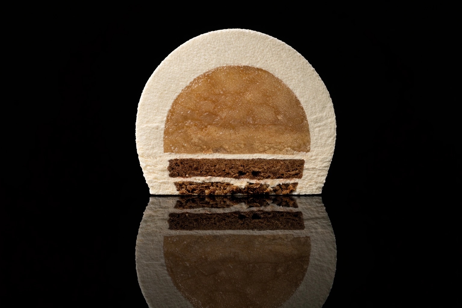 une ganache à la vanille délicatement onctueuse, un caramel crémeux aux notes vanillées, une crème de marron douce et enveloppante, et un confit de poire délicatement fruité, le tout reposant sur un croustillant de noisettes et un biscuit Sacher raffiné.