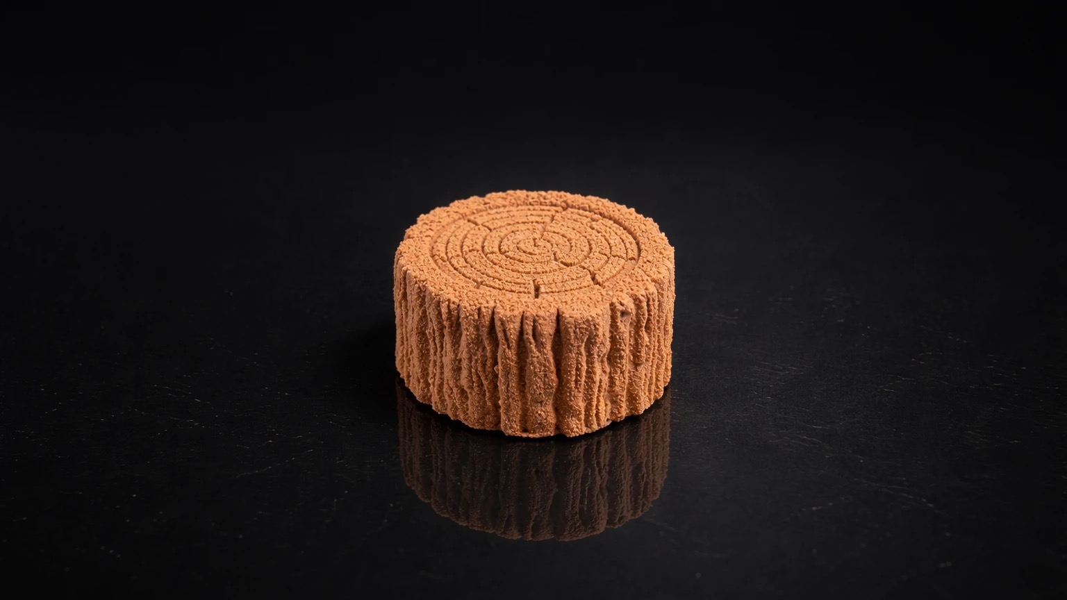 L’ensemble repose sur un biscuit chocolat-amande, à la fois tendre et structuré, offrant une base gourmande qui lie harmonieusement les textures et les saveurs.